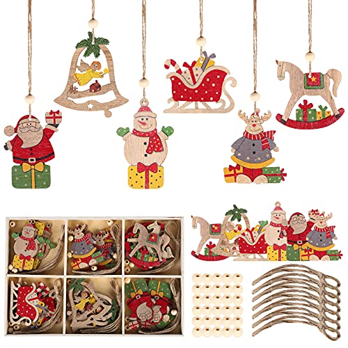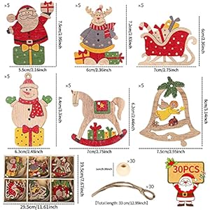 【Set di ciondoli per albero di Natale in legno】: il set contiene un totale di 30 ornamenti natalizi in legno, 30 corde di canapa e 30 perline. Sono disponibili in 6 stili diversi, 5 di ogni stile, offrendoti una vasta gamma di stili tra cui scegliere. Inoltre, siamo anche dotati di una scatola di legno da riporre.