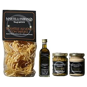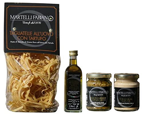 CONTIENE: Tagliatelle al Tartufo 250g; Cremosa al Tartufo 90g; Salsa di melanzane e Tartufo Estivo 90g; Condimento aromatizzato al Tartufo Bianco 55ml.