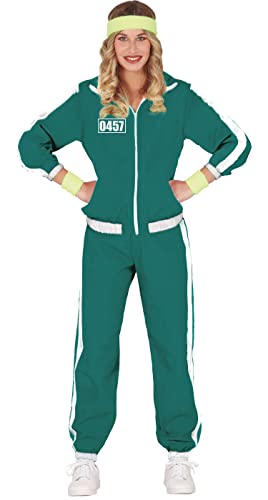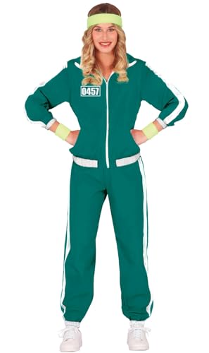 Questa tuta per partecipanti è per le donne e ha una giacca e un pantalone. La giacca è verde e ha una cerniera bianca. È decorato con strisce bianche sulle maniche e porta la scritta “0457”. La parte inferiore della tuta è dello stesso colore della giacca e ha strisce bianche sui lati. È aderente intorno alle caviglie. Sarai il partecipante numero 457 di Luce verde, Luce rossa con questa tuta durante il Carnevale o Halloween?