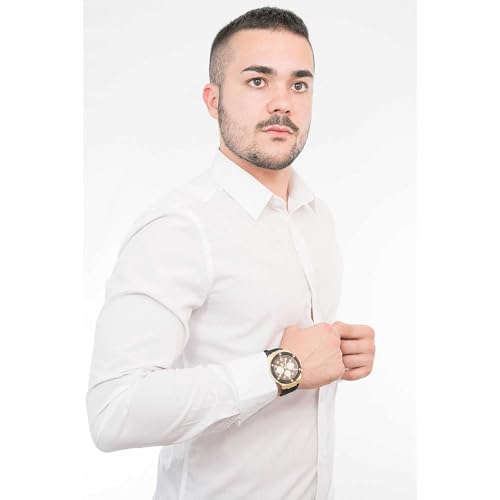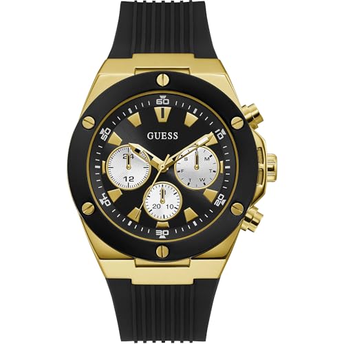 Orologio multifunzione da uomo di Guess. La dimensione della cassa è di 46 mm ed è in acciaio lucido oro. Il quandrante è nero con dettagli bianchi e oro con lunetta nera. Il cintirino è in silicone nero con texture, fibbia ad ardiglione. La resistenza all’acqua è di 50 metri. La referenza è gw0057g1