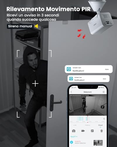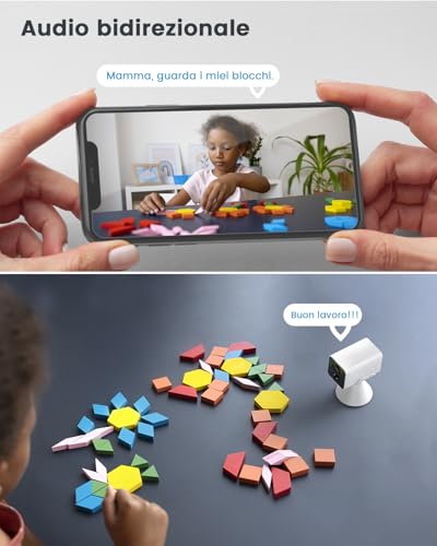 🎯【APP Intuitiva & Audio Bidirezionale】: L’applicazione mobile fornita con la telecamera wifi è intuitiva e offre un controllo completo sulle funzionalità. È facile visualizzare le registrazioni e ricevere notifiche in tempo reale. Tramite app si può controllare in diretta i tuoi animali domestici, i bambini. Grazie al microfono e all’altoparlante integrati, è possibile utilizzare la telecamera come citofono. Questa telecamera interno senza fili ideale per la sorveglianza domestica.