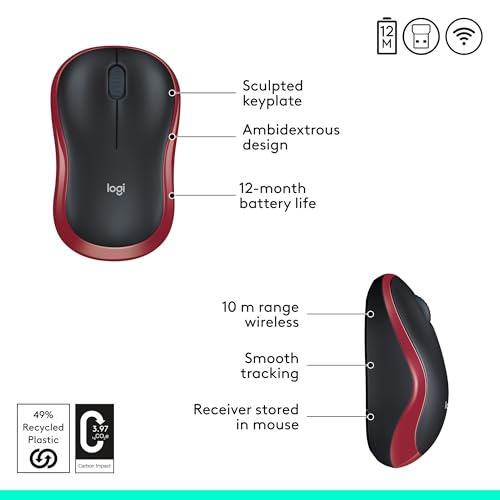 Logitech Mouse wireless M185. Un mouse semplice e affidabile con wireless plug-and-play. Ottieni l’affidabilità di un cavo con comodità e libertà wireless: trasmissione dati veloce e praticamente nessun ritardo o interruzione. La durata della batteria di 1 anno significa anche meno problemi. * Godrai dell’alta qualità e dell’affidabilità che hanno reso Logitech il leader globale per i mouse, oltre a una garanzia hardware limitata di tre anni. Il piccolo ricevitore nano funziona subito senza software ed è abbastanza piccolo da lasciare nella porta USB in modo da non perderlo. Inoltre, questo comodo mouse sagomato tratta la tua mano nel modo giusto. * La durata della batteria può variare in base alle condizioni dell’utente e del computer.