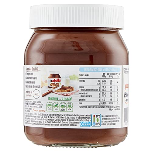 Da oltre 50 anni, Nutella fa colazione insieme a milioni di persone in tutto il mondo, ecco perché tutti sanno quanto è buona una fetta di pane con Nutella per cominciare la giornata; Grazie alla sua unica e inimitabile ricetta, Nutella è la crema spalmabile alla nocciola più famosa al mondo; Ogni vasetto di Nutella contiene 7 ingredienti di qualità, selezionati con cura, e nient’altro