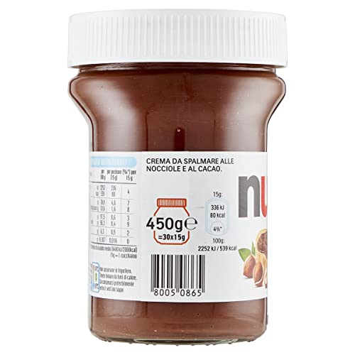 Nutella è famosa per l’autentico sapore di nocciole e cacao ed è resa ancora più irresistibile dalla sua distintiva cremosità; Il suo gusto delizioso assicura un’esperienza di puro piacere anche in una singola porzione: prendi 15 g di Nutella, circa un cucchiaino, spalmala su una fetta di pane e… mmmhhh, che gioia