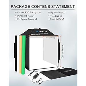 4 sfondi colorati: la scatola fotografica viene fornita con 4 sfondi colorati rimovibili (bianco/nero/arancione/verde) in PVC più spesso, abbastanza resistente e senza pieghe, in modo da poter cambiare facilmente i colori di sfondo e costruire diverse scene di ripresa come necessario.