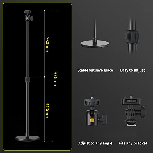SUPPORTO DA SCRIVANIA ROBUSTO E FLESSIBILE: Consiste in una base ponderata da 2,6 libbre, un palo telescopico da 27,5 pollici, una testa sferica a 360° e una scarpa fredda avvitabile da 1/4. Puoi spostarlo ovunque tu abbia bisogno di usarlo o usare la luce da sola su qualsiasi fotocamera e staffa