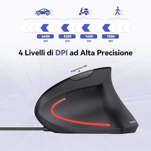 CONTROLLO PRECISO: Il mouse pc è dotato di un sensore ottico 6400/3200/1600/1000 DPI per soddisfare vari requisiti di velocità del mouse. La tecnologia di tracciamento ottico garantisce che il mouse abbia un’elevata sensibilità su diversi tipi di superfici. Collegati al tuo computer utilizzando il cavo USB da 1,5 m e inizia a lavorare immediatamente