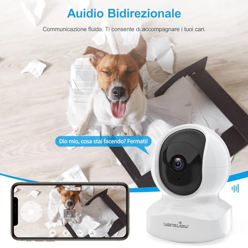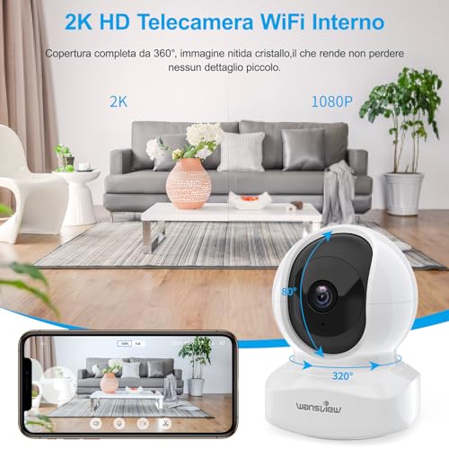 【2K ALTA RISOLUZIONE & INSTALLAZIONE FACILE】Con 2K risoluzione, la telecamera wifi interno ti offre video dal vivo nitide e fluido così riesci a tenere sotto occhio la casa tua sempre e ovunque. Facile da configurare a 2.4Ghz wifi (Non supporta 5Ghz) tramite app Wansview Cloud (IOS e Android) che parla italiano.