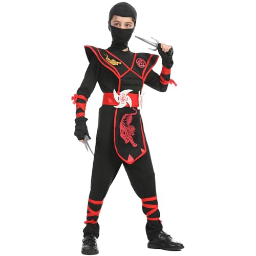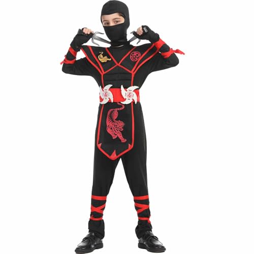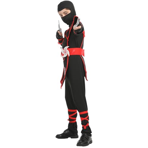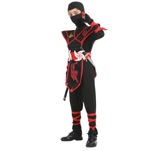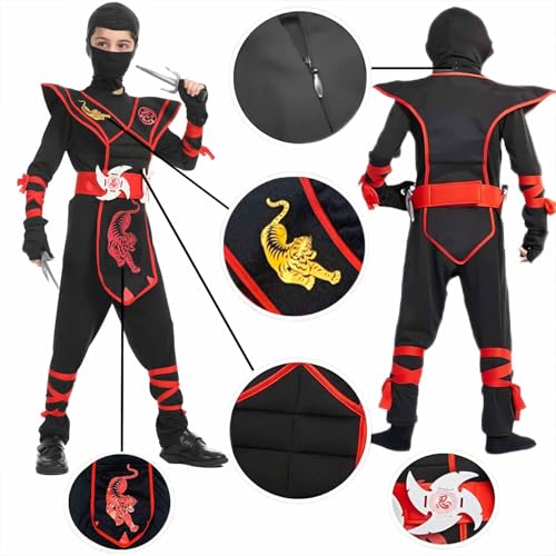Set costumi ninja deluxe: 14 pezzi – Vestito ninja per bambini, include 1 tuta, 1 gilet muscolare, 1 maschera facciale, 1 cintura, 2 guanti, 4 cinturini rossi alla caviglia e 4 altri accessori in schiuma. È una tuta completa, abbinala a un set di giochi ninja.